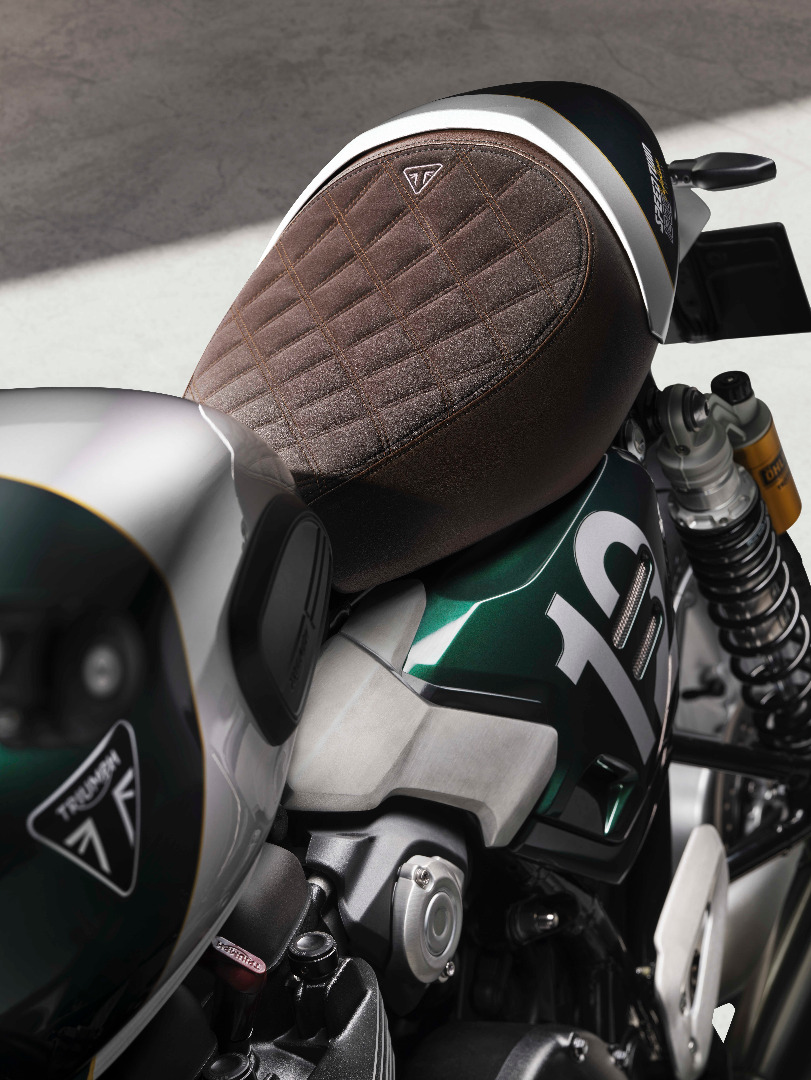 De elegante sportieve uitstraling wordt bepaald door de lage, compacte rijhouding die ontstaat door de clip-ons, het gestroomlijnde monozadel en de verfijnde aandacht voor detail over de hele motor. Gefreesde bar-end spiegels versterken het strakke silhouet, terwijl geribde badges op de koppelings- en dynamodeksels, zwarte cilinderkopdeksels en gevormde kniesteunen zorgen voor subtiele maar onderscheidende accenten.